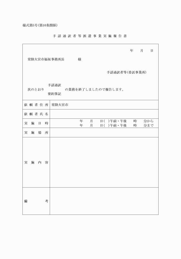 第10条 手話通訳者等又は受託団体は,手話通訳及び要約筆記の業務が終了したときは5日以内に,手話通訳等業務実施報告書(様式第5号)により所長に報告しなければならない。