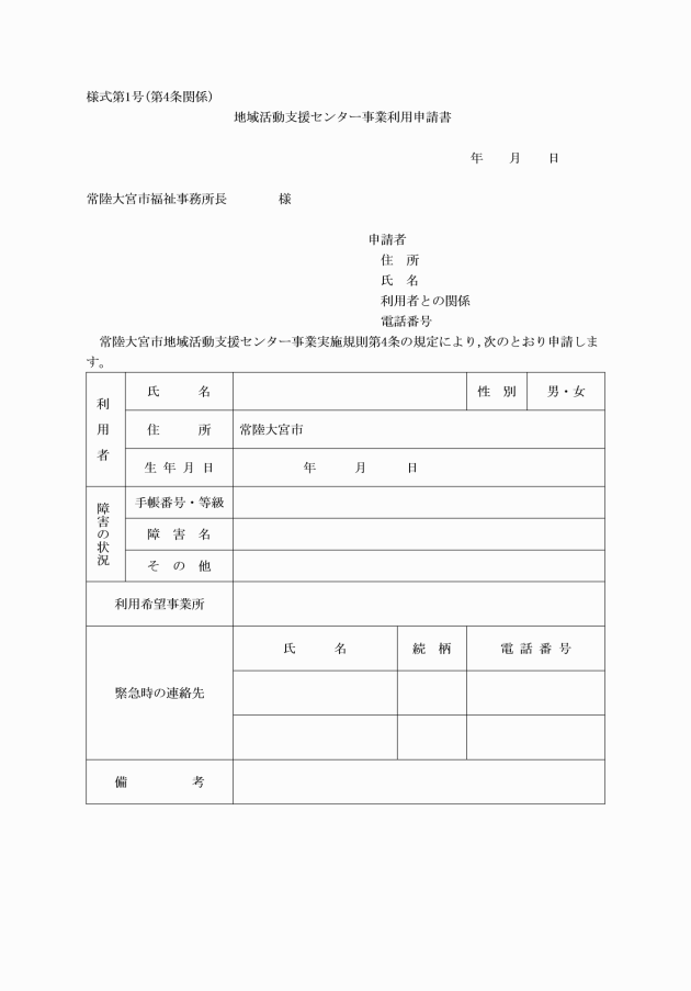 第4条 事業を利用しようとする者は,地域活動支援センター事業利用申請書(様式第1号)を所長に提出するものとする。