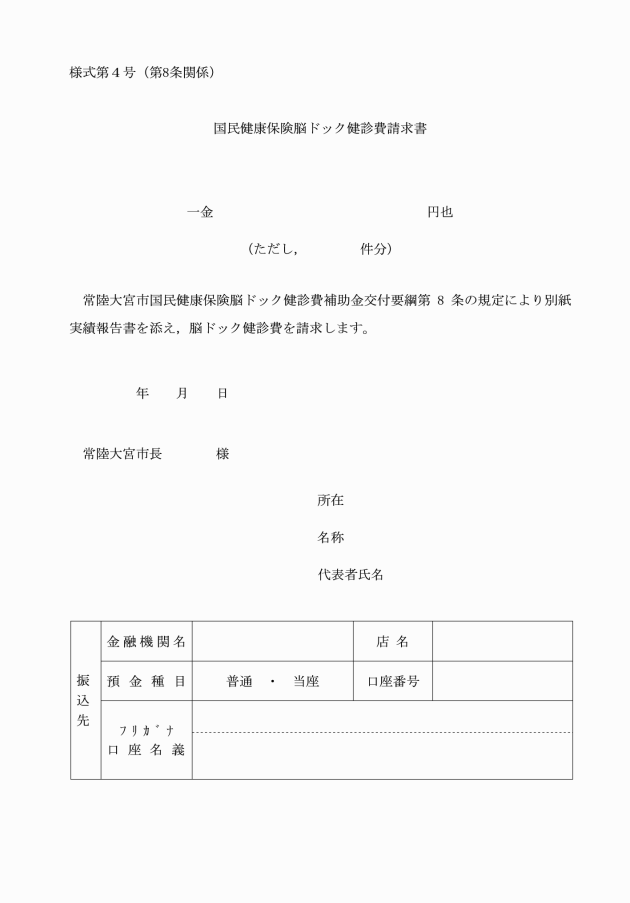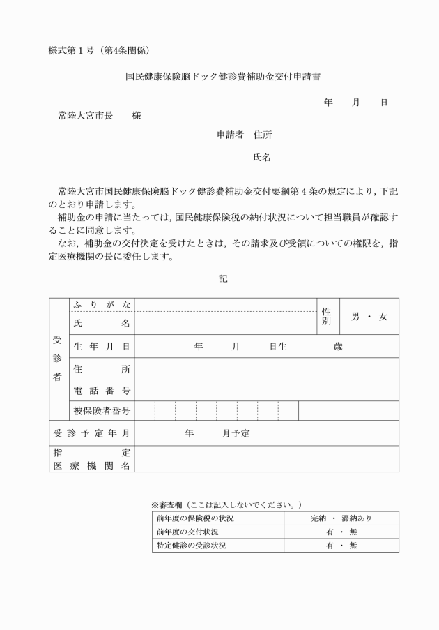 第4条 補助金の交付を受けようとする者は,国民健康保険脳ドック健診費補助金交付申請書(様式第1号)を市長に提出しなければならない。