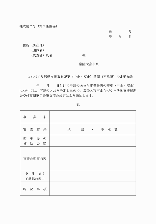 第7条 補助金の交付決定を受けた者(以下「交付決定者」という。)は,当該補助金の交付対象となった事業(以下「補助事業」という。)の内容を変更(補助対象経費の20%未満の減額その他の軽微な変更は除く。)し,又は補助事業を中止若しくは廃止しようとするときは,まちづくり活動支援事業変更(中止・廃止)承認申請書(様式第6号)を市長に提出し,その承認を受けなければならない。
